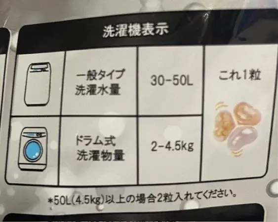 縦型洗濯機・ドラム式洗濯機どちらのタイプでも使用可能。縦型洗濯機なら30~50Lまで1粒でOKです。ドラム式洗濯機なら2~4.5kgまで1粒でOK。